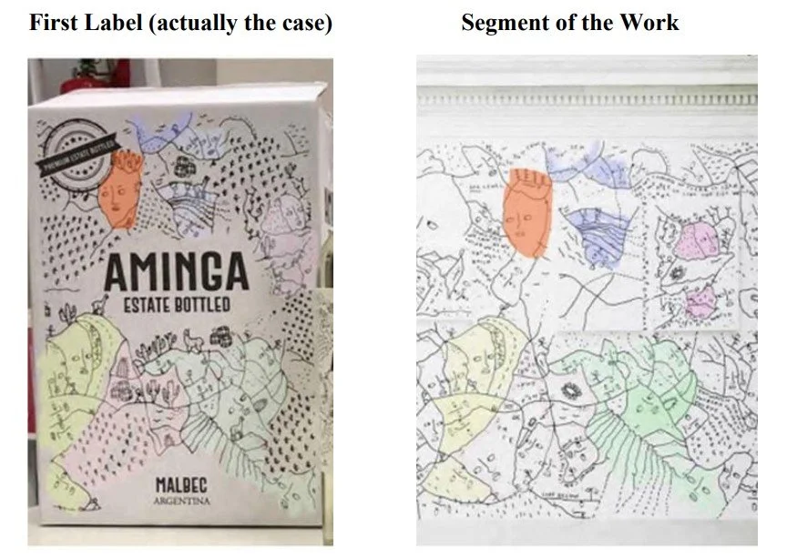 First wine label (L) and Shantell Martin work (R), colour-coded by the claimant artist to highlight copying.